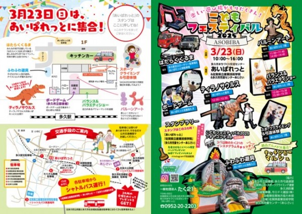 今年も「こどもの記憶に残るASOBIBA」をコンセプトに、子どもが遊びを通して楽しく経験が出来る、体験型イベントになっておりますので、家族そろってお出掛けください。佐賀県産業技術学院と多久市児童センター「あじさい」とのコラボレーションイベントとなっています。佐賀県産業技術学院では、自動車整備士・溶接・電気ゲーム・大工等の体験ができます。多久市児童センター「あじさい」では乳幼児や小学生を対象にリズムダンス・こどもクッキング体験等盛りだくさんです。「あいぱれっと」ではふわふわ遊具・スポーツクライミング・弓道体験等で楽しめます。この3箇所の会場を回ってスタンプ集めてプレゼントをゲットしてください!キッチンカーもあります!