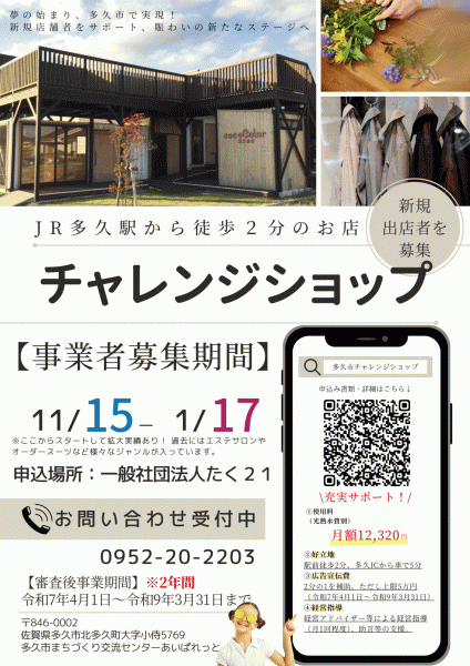 新規出店を希望する意欲のある事業者を対象に、多久駅北口エリアの多久市ワーキングサポートセンター内にあるコンテナハウスを商業施設として貸し出し、新規起業者の支援や育成を行いながら経営基盤の構築を図ります。また事業終了後は新規起業者が中心市街地内(もしくは市内)に独立開業ができるように支援を行い、新規起業の機会創出と多久駅周辺の活性化や賑わいの創出を図り、中心市街地の活性化と魅力の向上を図ることを目的とします。