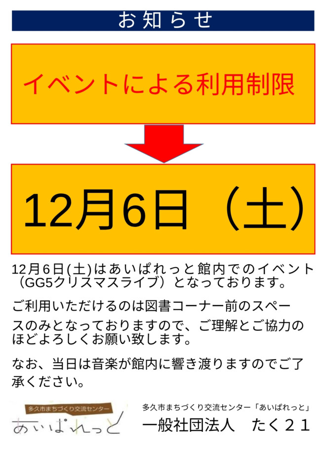 12/6(土)はまちづくり交流センターあいぱれっとでイベントのため、あいぱれっと館内の利用を制限しております。